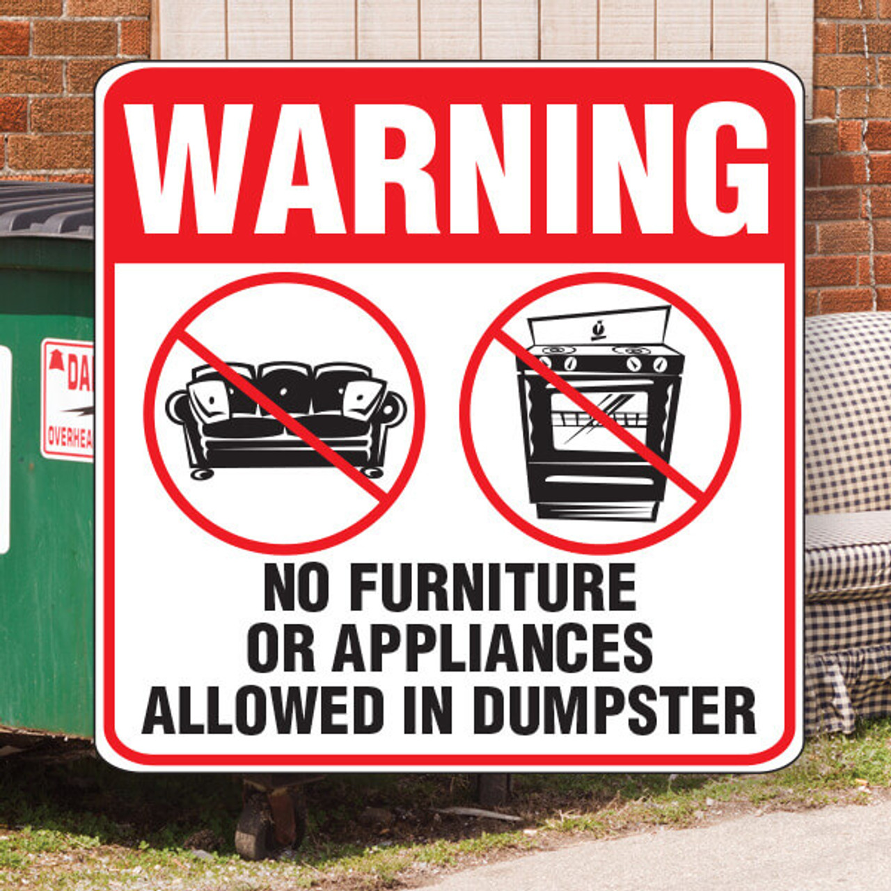 24 X 24 Warning No Furniture Or Appliances Allowed In Dumpster Sign Signquick